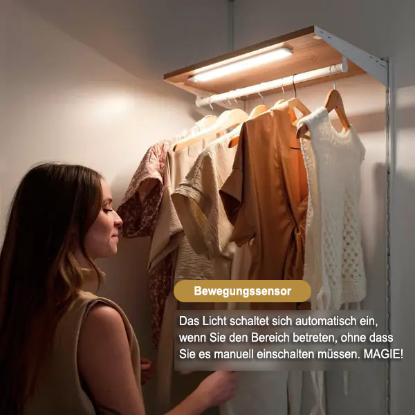 Erleichtern Sie sich das Anziehen, indem Sie diese Leuchte in Ihrem Kleiderschrank anbringen. Sie leuchtet automatisch, wenn Sie die Tür öffnen, und hilft Ihnen, Ihre Kleidung zu finden, ohne im Dunkeln zu tappen.